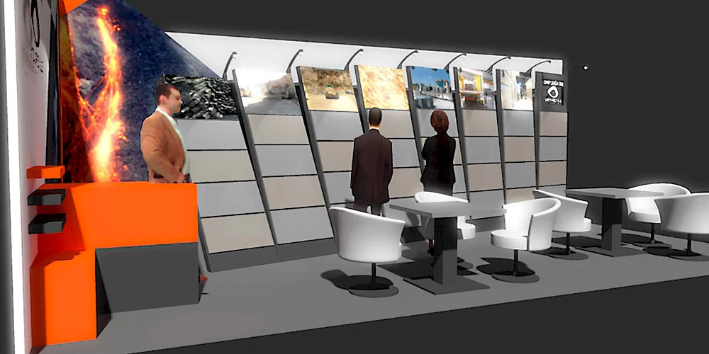 Návrh veletržního stánku pro dodavatele obkladových kamenných desek.