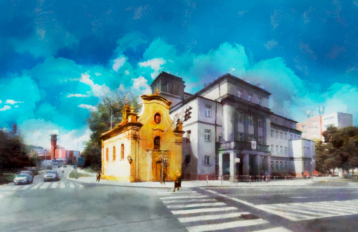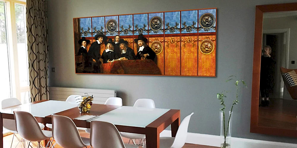 Digitální malba - závěsný obraz - s využitím pečlivě zrekonstruovaného Rembrandtova motivu a vlastního designu pozadí. Rozměry 250x100 cm, rozlišení pro tisk 200 dpi.