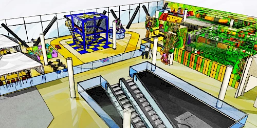 Promo skicy prostoru dětského koutku na podkladě půdorysného rozvržení vybavení - pro nabídkový materiál firmy Time Out Plus