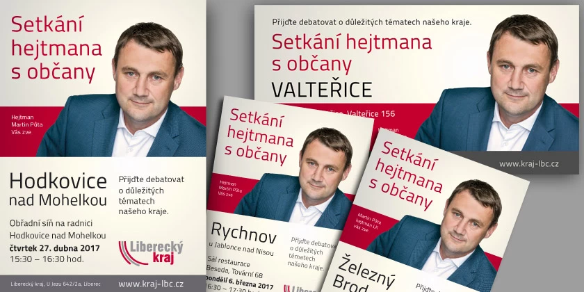 Série plakátů a Facebookových upoutávek pro pravidelná setkávání hejtmana Libereckého kraje s občany.