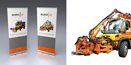 RollUp pro Silnice-LK a.s. s vektorizovaným motivem silničních strojů.