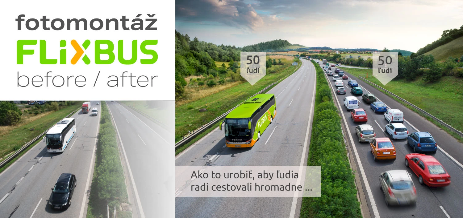 Fotomontáž pro propagaci hromadné dopravy z mnoha zdrojových fotografií a "oblečení" autobusu do firemních barev Flixbus.